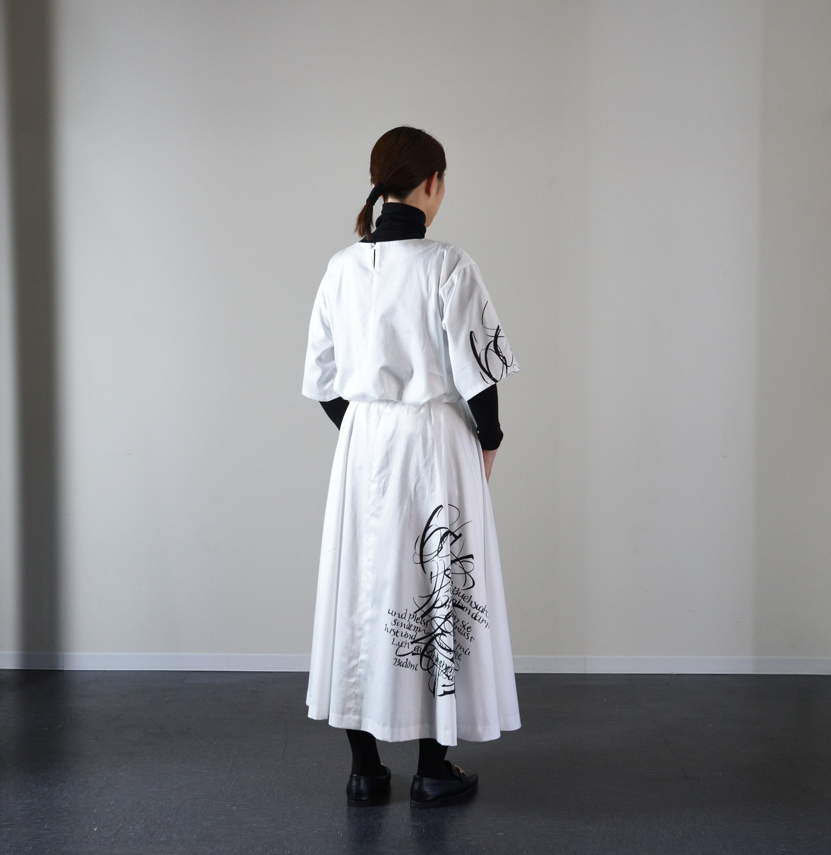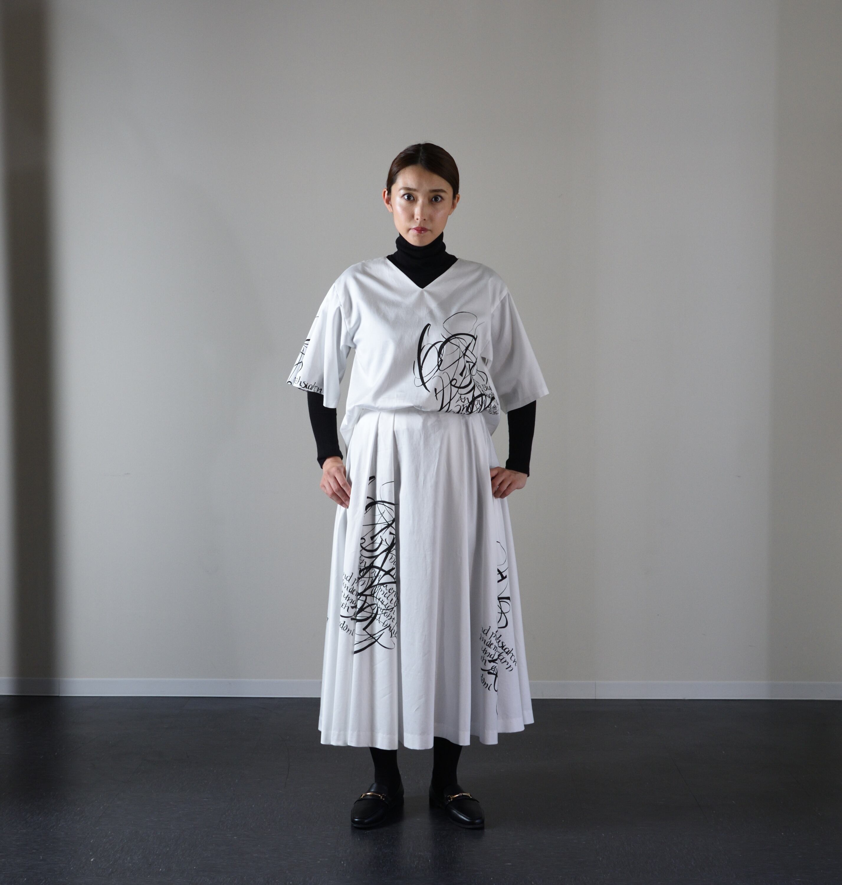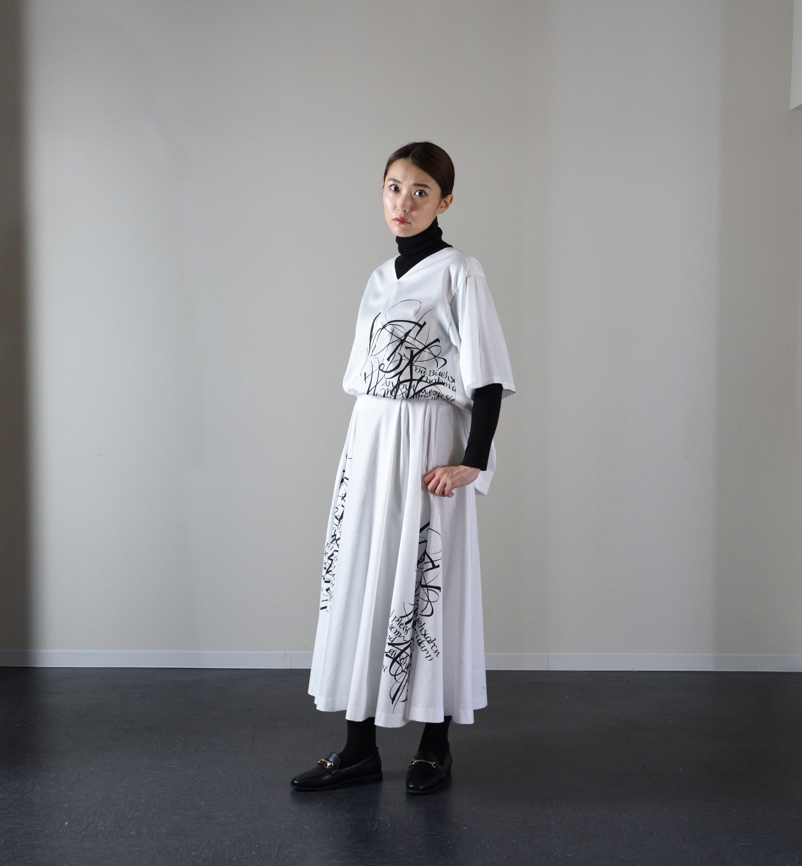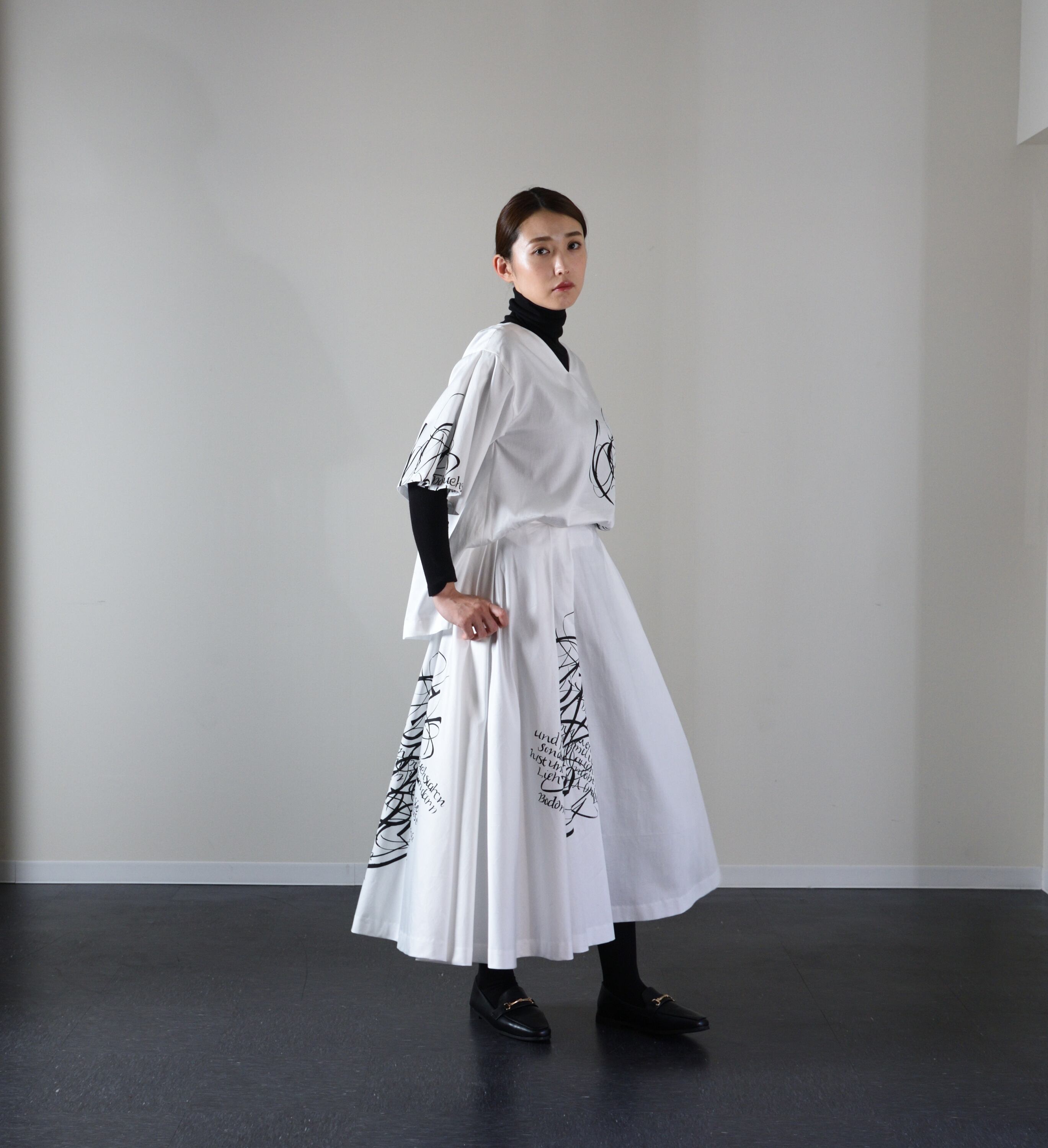 タックプリーツとインパクトのあるプリントが目を引く、コットン素材スカート。