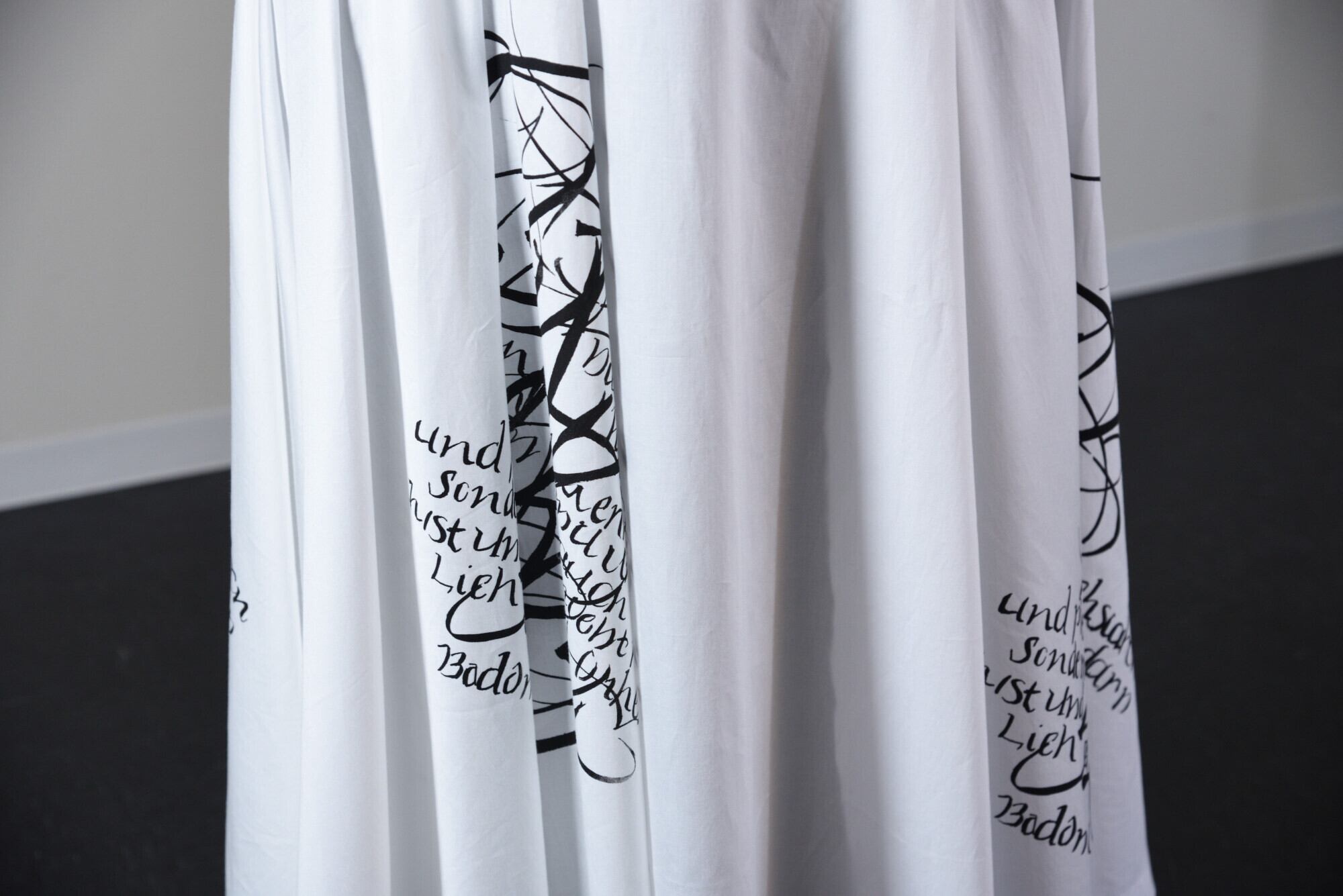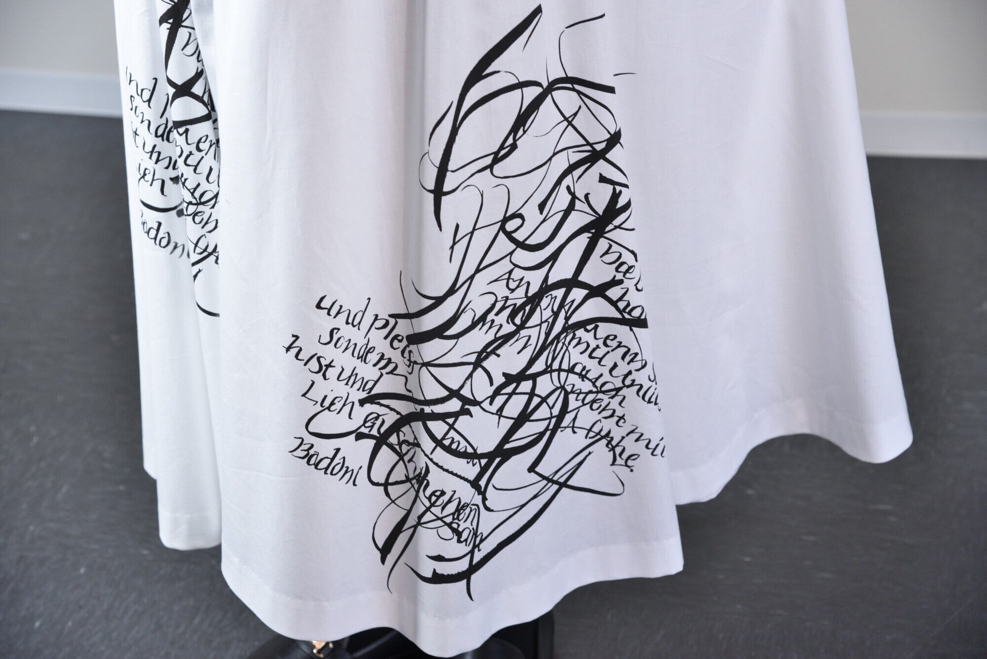 ランダム方向に大胆に走るタックが、光沢のあるコットンサテンの多数の面ができることで凹凸感と奥行が表現されています。